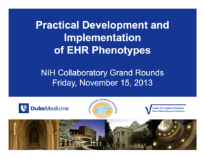 Researchers at Duke University’s Center for Predictive Medicine are developing and testing methods to quantify the validity and reliability of certain computable phenotype definitions. (See “Practical Development and Implementation of EHR Phenotypes”; NIH Collaboratory Grand Rounds; November 15, 2013.)