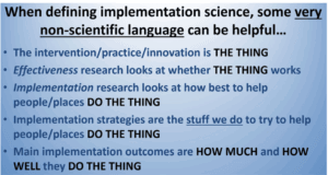 Part of implementation research is to describe gaps in use of “the thing” (an evidence-based practice), including relevant barriers and facilitators that can impact use at the patient, provider, and/or organizational levels.