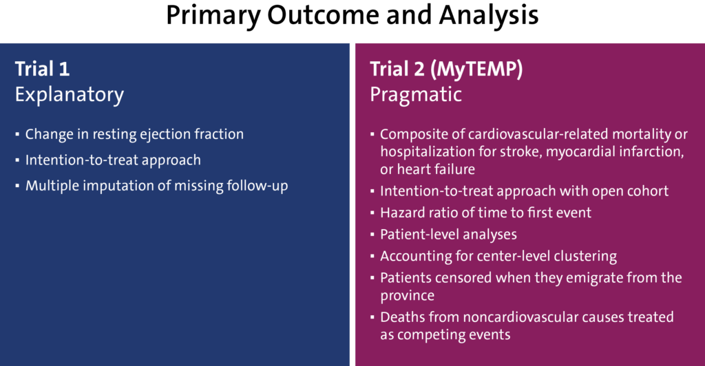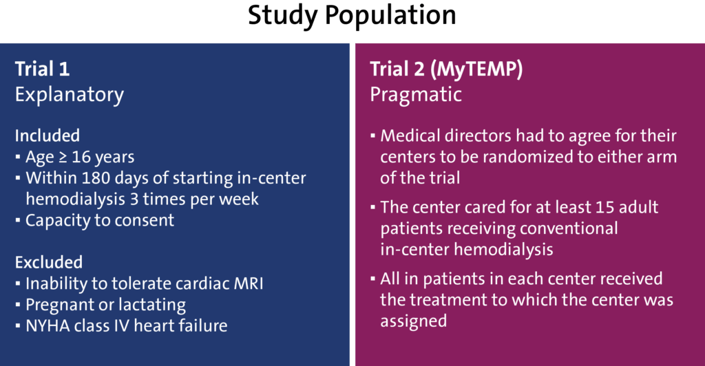 In terms of the trial population, Trial 1 (shaded in blue) was restrictive in its inclusion criteria, having individuals aged 16 years and older who started hemodialysis at the renal clinic setting within the last 180 days and who had the capacity to provide informed consent. In addition, individuals were excluded if they could not tolerate cardiac MRI, were pregnant or lactating, or were classified with New York Heart Association class IV heart failure.