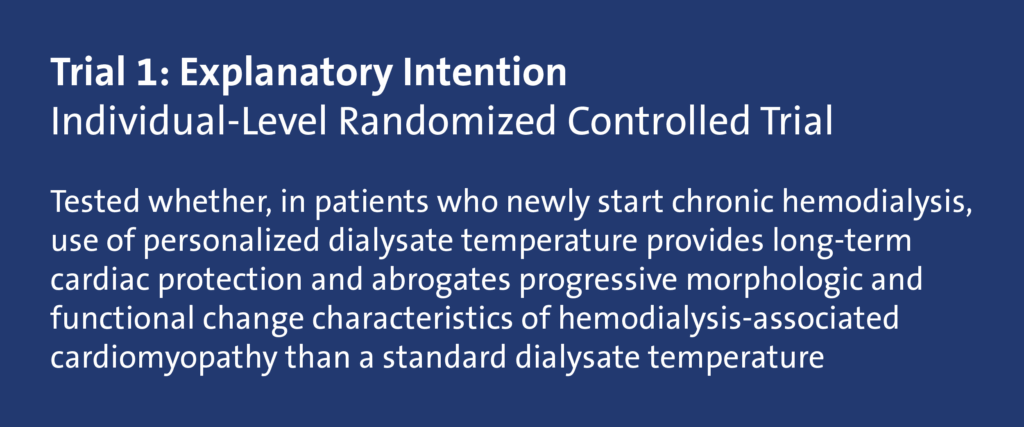 Trial 1 (shaded in blue) required specific dialysis machines, research nurses, and specific thermometers to implement the study intervention. In comparison, Trial 2 retained the dialysis machines in use at each included center and allowed the dialysate temperature in the intervention arm to be set in the range of 0.5 to 0.9 degrees below the patient's body temperature. Also, the entire trial—at the clinic level—was implemented by clinicians and nurses rather than researchers. Little local research infrastructure was required in the recruiting clinics to implement the trial due to this flexibility.