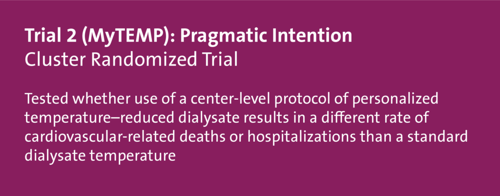 In comparison, Trial 2 (shaded in red) had less restrictive inclusion criteria, which widened its applicability to most usual care providers, patient populations, and settings. For efficiency (that is, ease of trial conduct) and to match the nature of policy on dialysate temperature, which is set by each dialysis center, rather than for individual patients, randomization was at the clinic (or cluster) level. In this design, the medical director of each clinic agreed for their clinic to be randomized to either trial arm, and all patients were part of the trial. A waiver of individual patient consent was sought and granted.