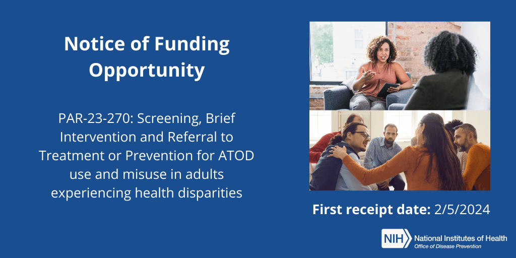 The National Institutes of Health’s Office of Disease Prevention (ODP) issued a new funding opportunity to support implementation studies in treatment and prevention for alcohol, tobacco, and other drugs use and misuse in adult populations that experience health disparities.
